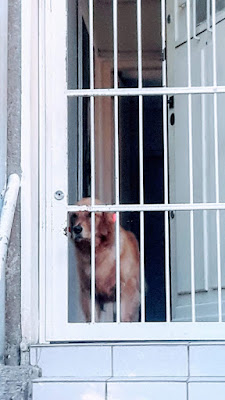 Cachorro cabisbaixo, atrás de grades, espera que os donos regressem rápido